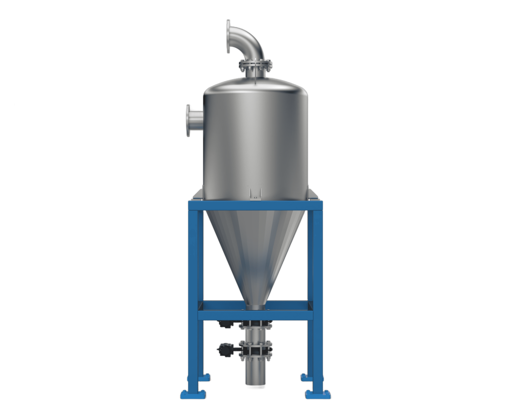 Meal-handling exhaust and any particulate-laden air from the dryer outlet pass through a cyclone dust separator before entering the scrubber. Centrifugal force drives bone meal particles — typically 10–200 µm — to the hopper wall, achieving 85–95% collection efficiency for particles above 10 µm. Collected meal is returned to the production stream, recovering product value while protecting scrubber packing from blinding.